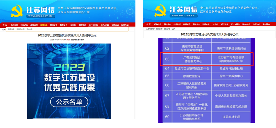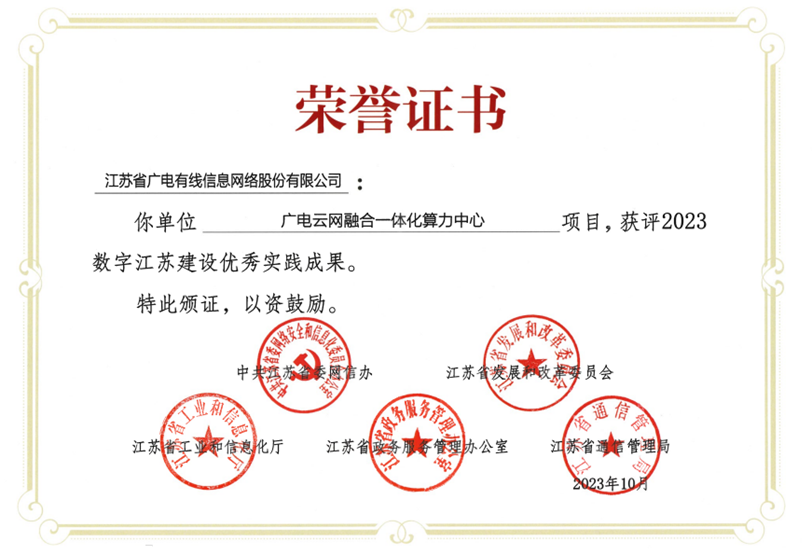 近日,在省委网信办等五部门联合组织开展的2023数字江苏建设优秀实践成果征集工作中,江苏有线申报的《广电云网融合一体化算力中心》成功获评。